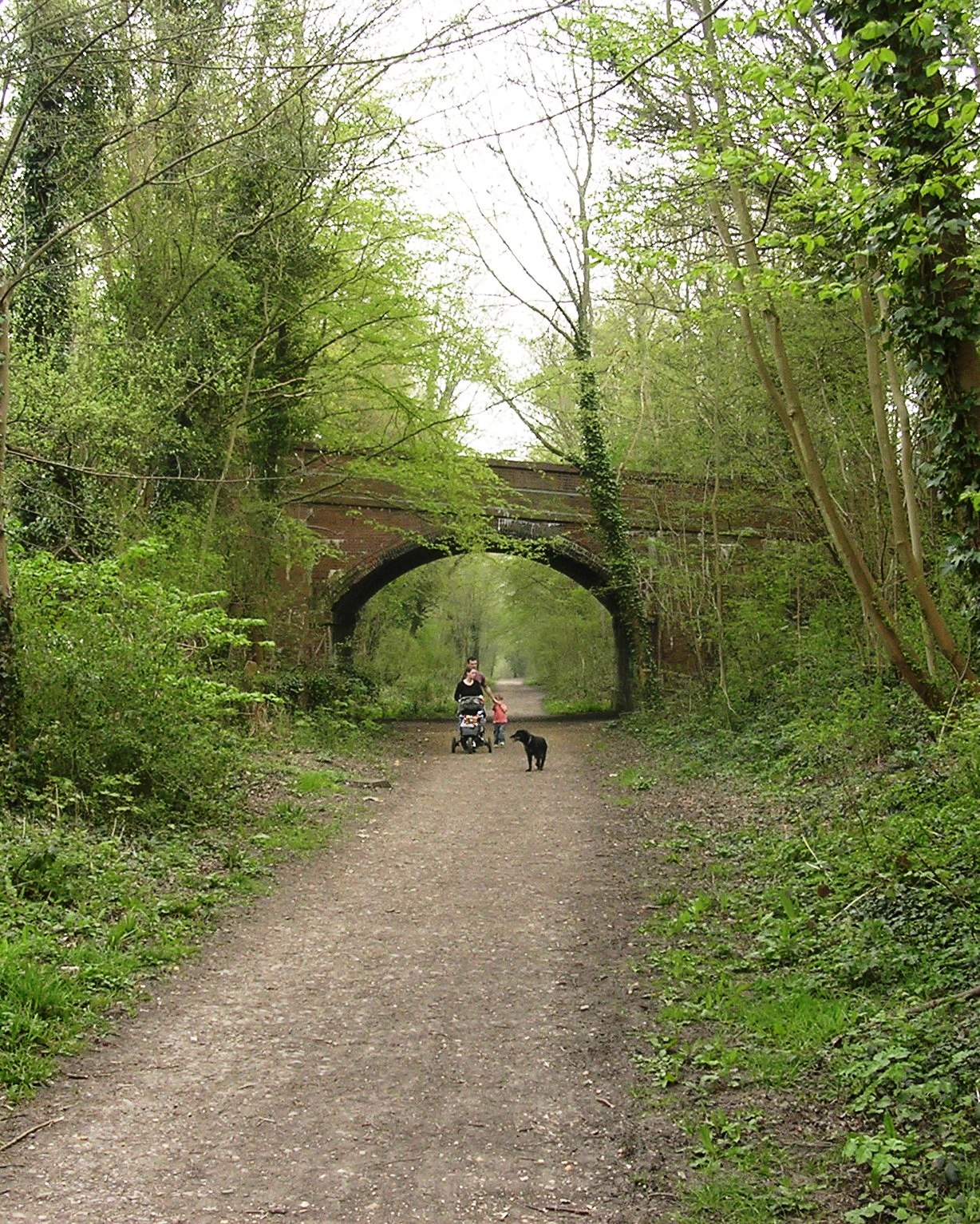 The Downs Link footpath now follows the wooded former railway line. this photo is right in the centre of Rudgwick where the bridge carries Church Street