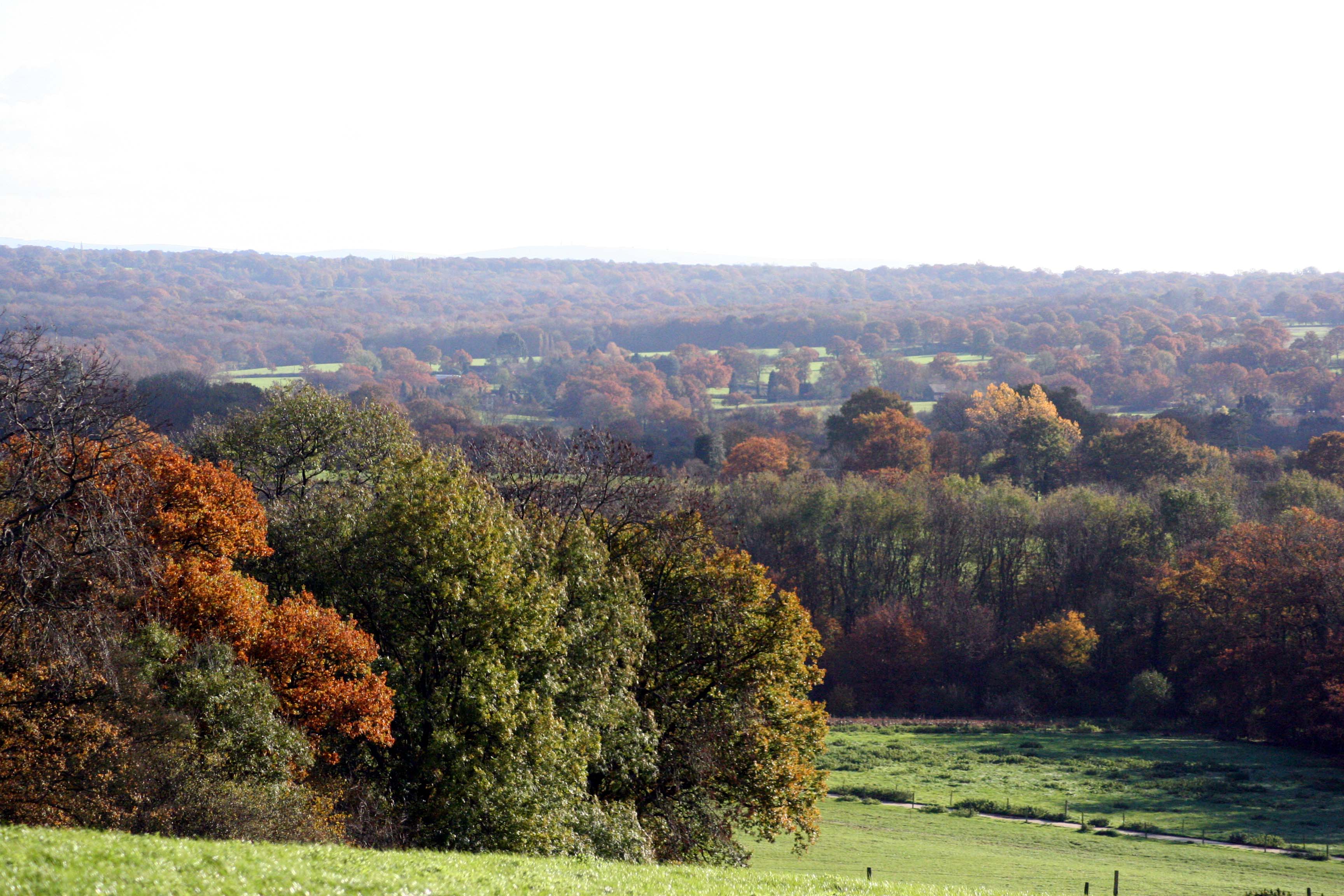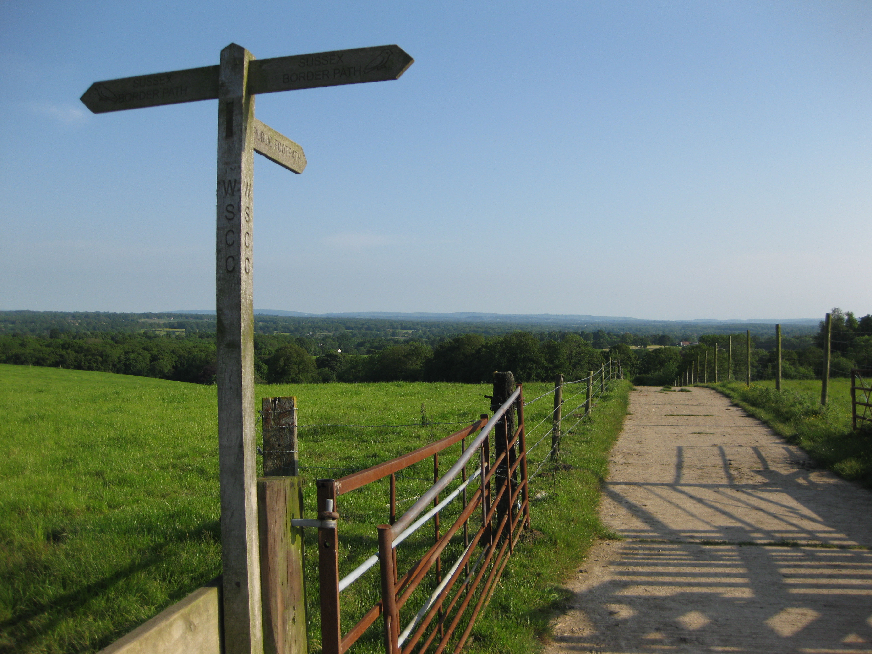 Rudgwick Ridge provides vantage points with views to the South Downs. Here the Sussex Border Path crosses the track up from Lynwick